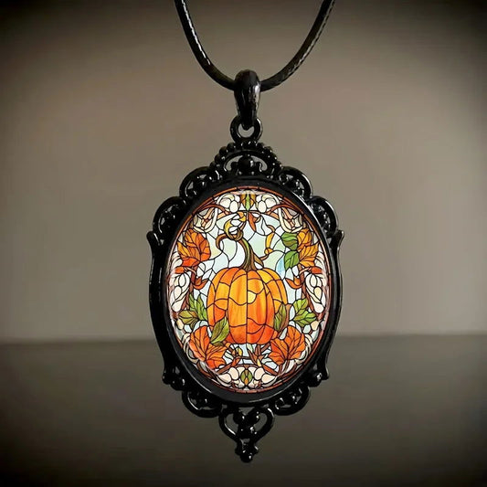 Elegant Oval Glass Pendant Necklace With Pumpkin Pattern